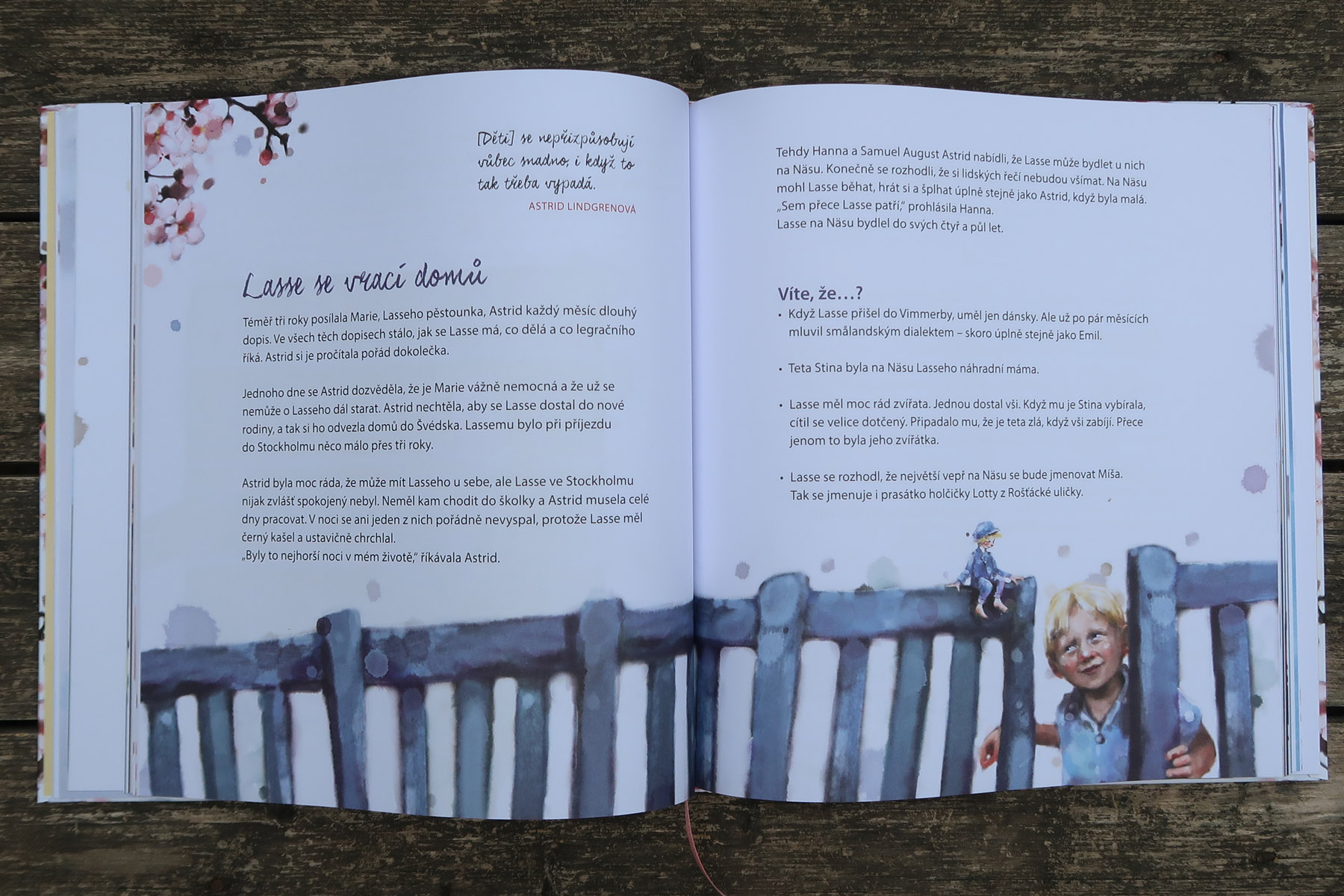 Text je výborne upravený pre malých čitateľov od 6 rokov. Nezamlčuje neľahké okolnosti, snaží sa ich popísať v čo najlepšom svetle. Mladá Astrid mala tajný vzťah so ženatým mužom a otehotnela. Musí sa sama presťahovať do Stockholmu a synčeka na tri roky zveriť opatrovateľke v Dánsku. V knihe je citlivo vysvetlené, že kedysi to nebolo také zvláštne ako sa to zdá dnes. Je zdôraznené, že malého Lasseho veľmi milovala a robila všetko, čo bolo v jej silách, aby s ním mohla byť. Celkovo táto pasáž (a aj iné) vyznieva veľmi pozitívne, bez odsudzovania ale aj bez zľahčovania nešťastia.