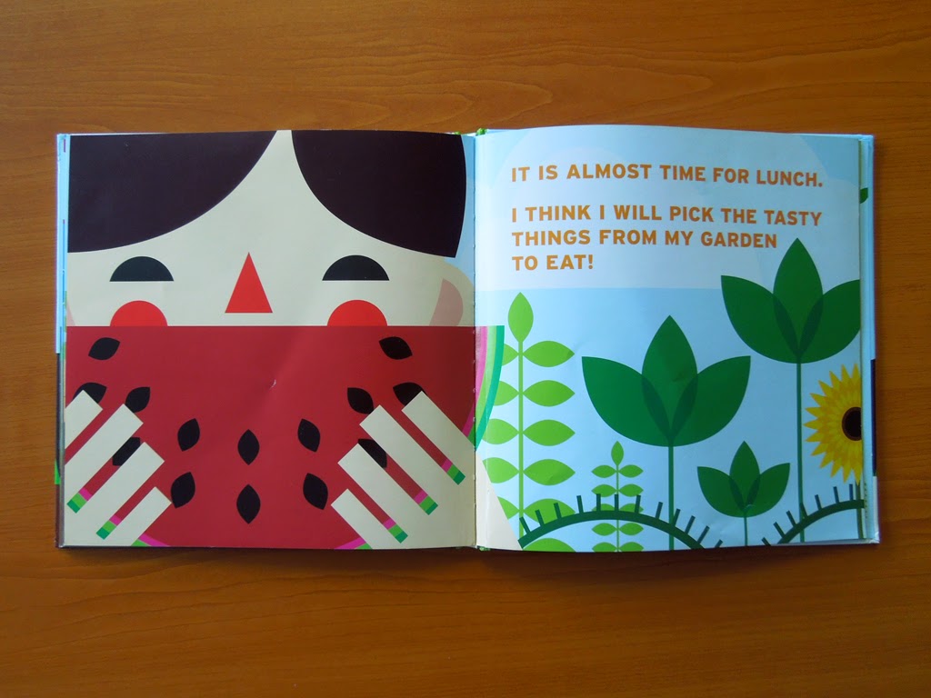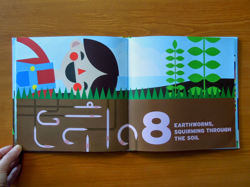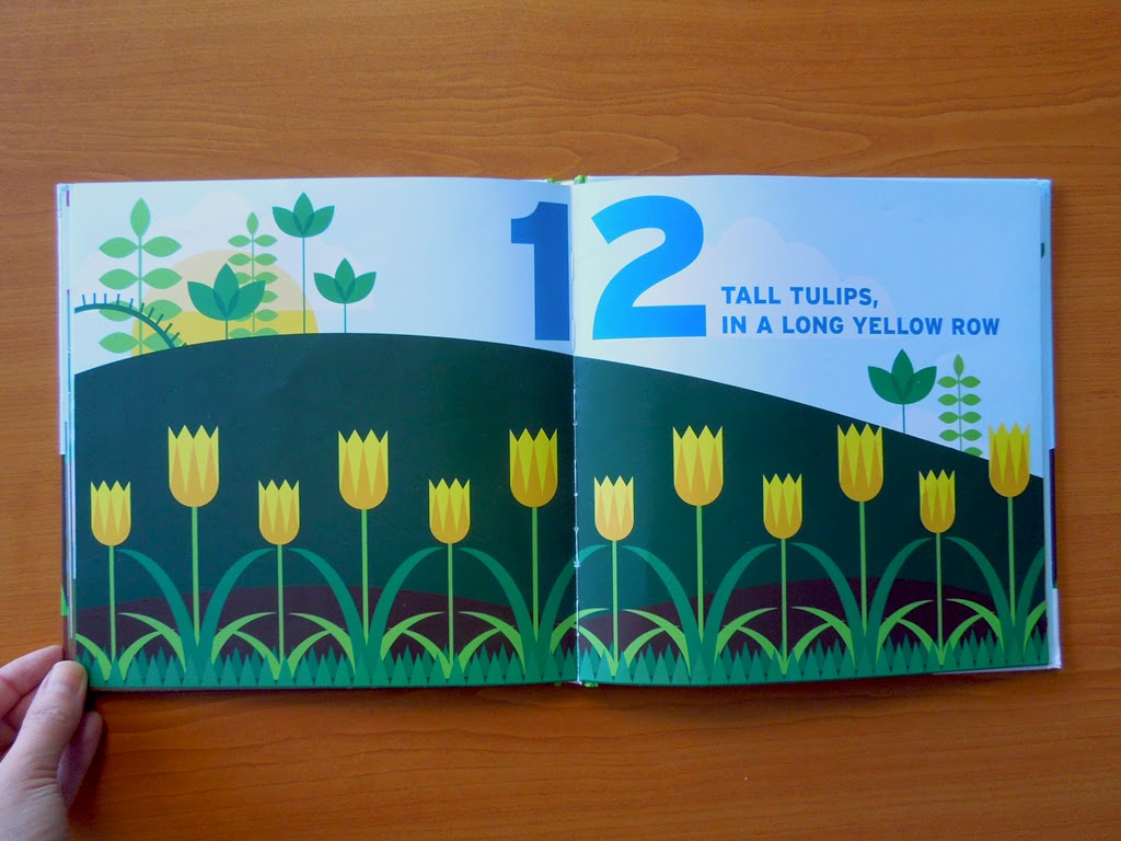 Na prácu s číslami je kniha ideálna. Dvojstrany s číslom a obrázkom (1 onion, 2 turnips,… 12 tulips) strieda dvojstrana samotnej záhrady. Do tej sa postupne pridáva zelenina, kvetinky alebo hmyz v príslušnom počte. Skrátka všetko, čo môžete v takej záhradke za domom nájsť.