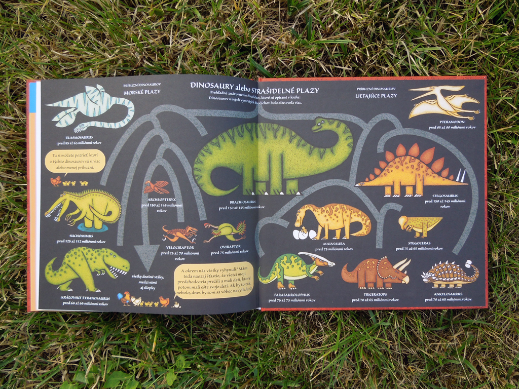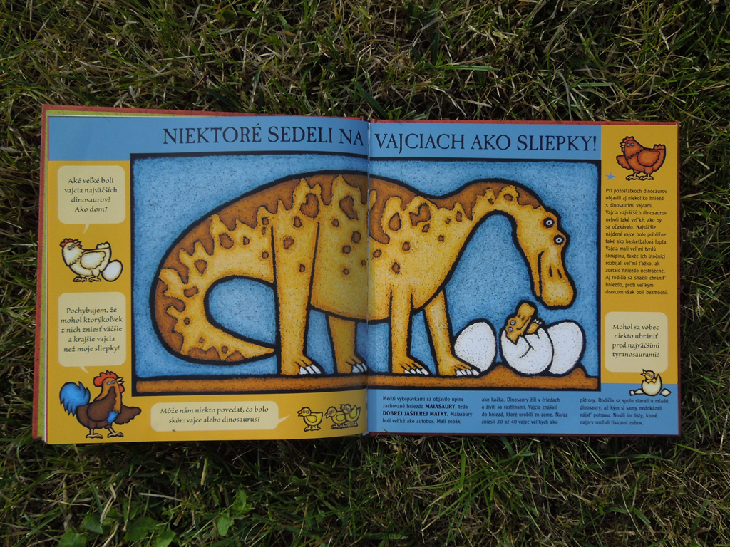 Dinosaury?! je určená pre deti od štyroch rokov. Veľké a prehľadné obrázky, na každej strane jeden zástupca skupiny pravekých tvorov. Informácií tak akurát, aby vaše dieťa nebolo rýchlo presýtené. Pretože dinosaury sú vlastne predkovia vtákov, celou knihou vás sprevádza slepačia rodinka. Kuriatko a jeho zvedavé otázky vás pekne posúvajú zo strany na stranu. A slepačie komentáre sú vtipné. Pre malého pampúcha určite a ja sa tiež občas pousmejem. Bude vás to spolu baviť, uvidíte.