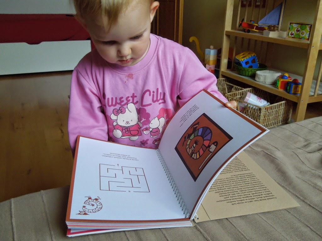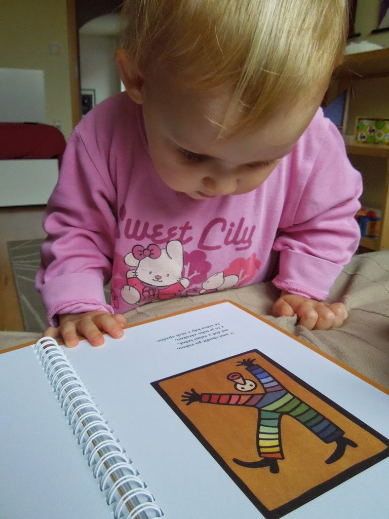 Na každej dvojstrane je písmeno, básnička a úloha pre deti. Kniha je z tvrdých papierov, v krúžkovej väzbe, ideálna na kreslenie. Ale to nás čaká až o niekoľko rokov =) Zatiaľ len precvičujeme akrobatické polohy K.