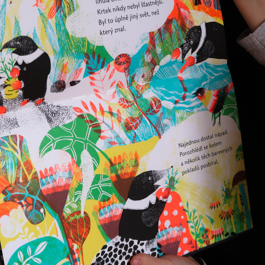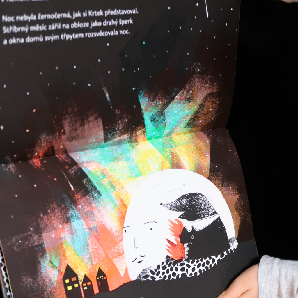 Symbolický príbeh, ktorý môžete čítať na rôznych úrovniach, je krásny a dojemný. Ale ešte zaujímavejšie sú nádherné ilustrácie Terezy Šedivej. Autorka sa prefíkane hrá s netradičným formátom. Rozdeľuje strany na polovicu. Pod zemou v Krtkovej nore prevláda čierna a biela. Všetko to farebné dobrodružstvo, a nie je ho málo, sa odohráva nad povrchom. Postupne však Krtko púšťa život aj do svojej polovice. Začína to slnečným lúčom, pokračuje výbuchom polárnej žiary a končí okúzlujúcim mixom toho najlepšieho, čo ponúkajú oba svety. Krtko, ktorý bol na začiatku sám, má útulný domček plný farieb aj kamarátov.