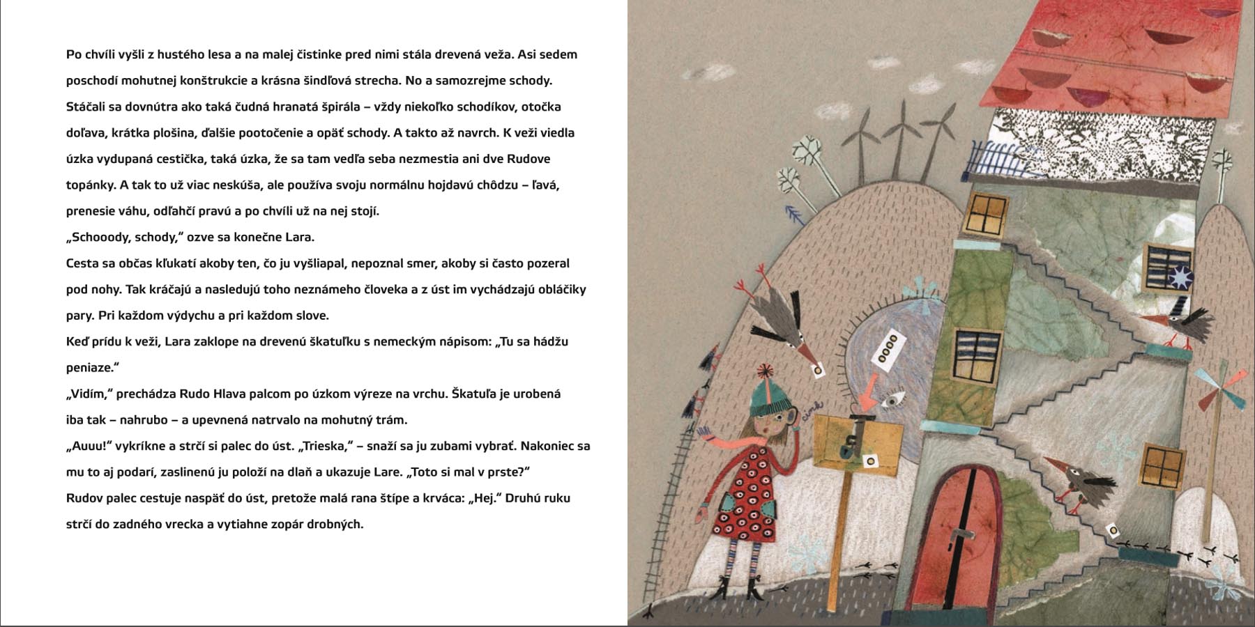 O čom sa môžu baviť dospelý strýko s päťročnou neterou cestou na kopec? O sliepkach, veterných mlynoch, cviklovej zmrzline… Ale aj o strachu. Z tmy, výšky, samoty. Ešte šťastie, že proti strachom sa dá bojovať aj pevným stisnutím ruky alebo pesničkou.