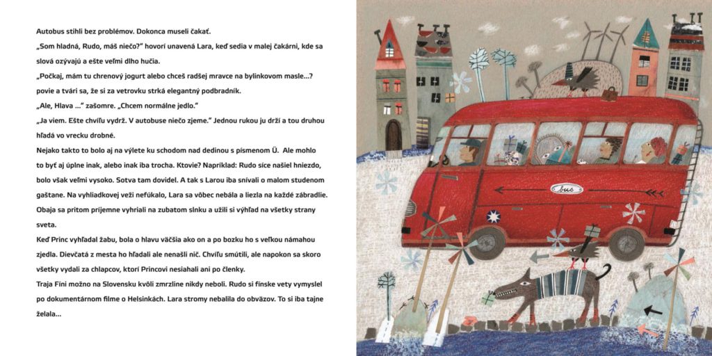 Neviem, čo doteraz robila Jana Kalixová, ale dúfam, že sa s jej ilustráciami budeme stretávať častejšie. Jej zimné krajinky sú kolážou všetkého, čo sa v príbehu deje. Vôbec nie sú studené, ale príjemne zasnené. Ako rozprávka. Jednoducho nádhera.
