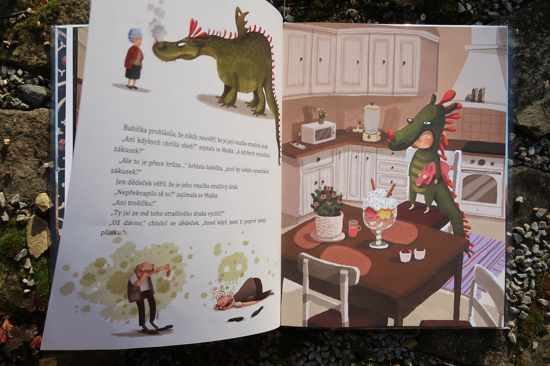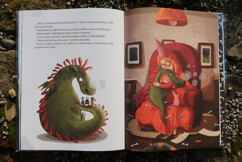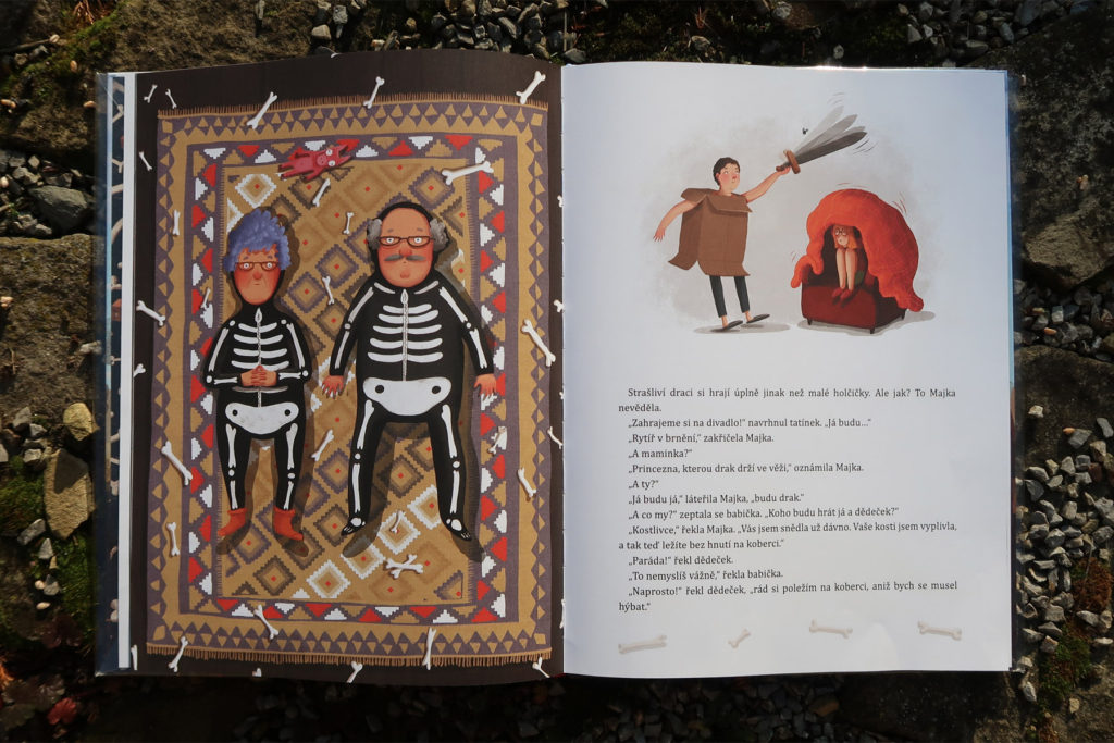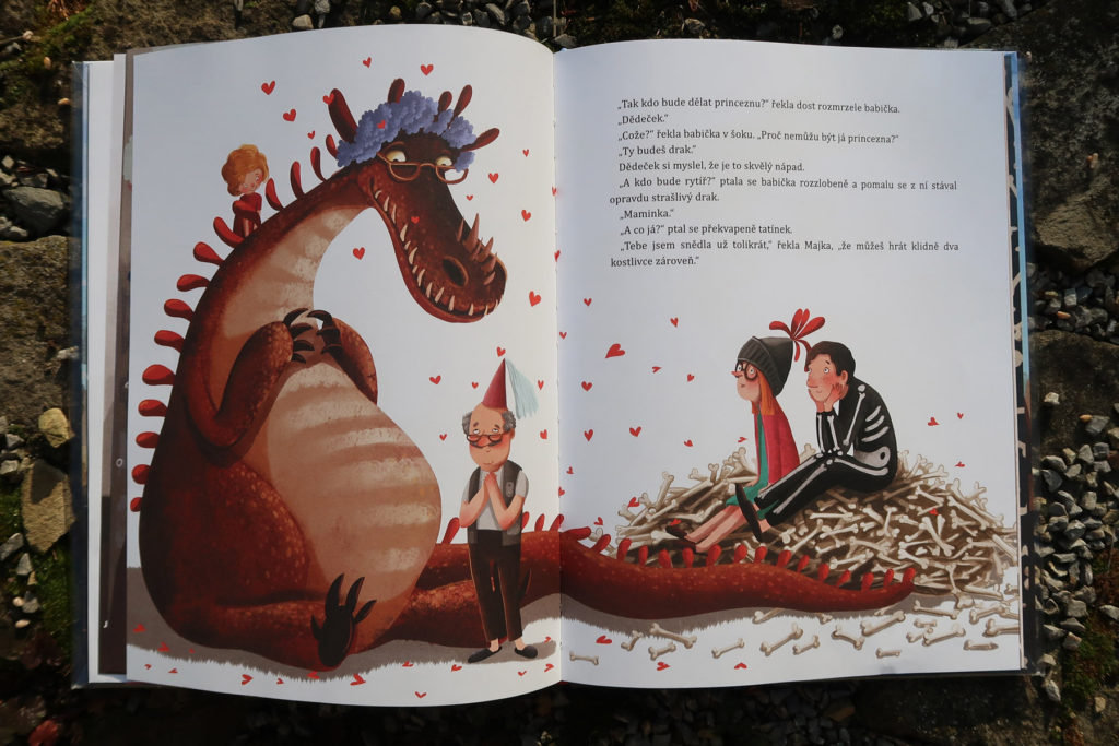 Majka sa jedného dňa premení na draka. Celá rodina je v pomykove: ako sa z tak malého dievčatka mohol stať taký strašný drak? Chrúme rytierov aj s brnením a kosti vypľúva rovno na koberec. „Na koberec nie!“ hrozí sa maminka. No dobre, ale ako sa takí hroziví draci vlastne hrajú? Na divadlo! Majka už je Majka, teda drak. Maminka môže byť princezná, tatinko rytier a z dedka a babky budú skvelé kostry. A prečo vlastne Majka nechce byť princezná? Pretože je je vraj na princeznú moc škaredá…