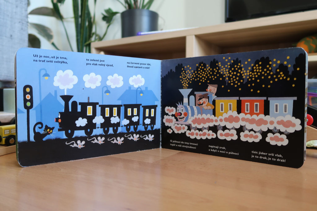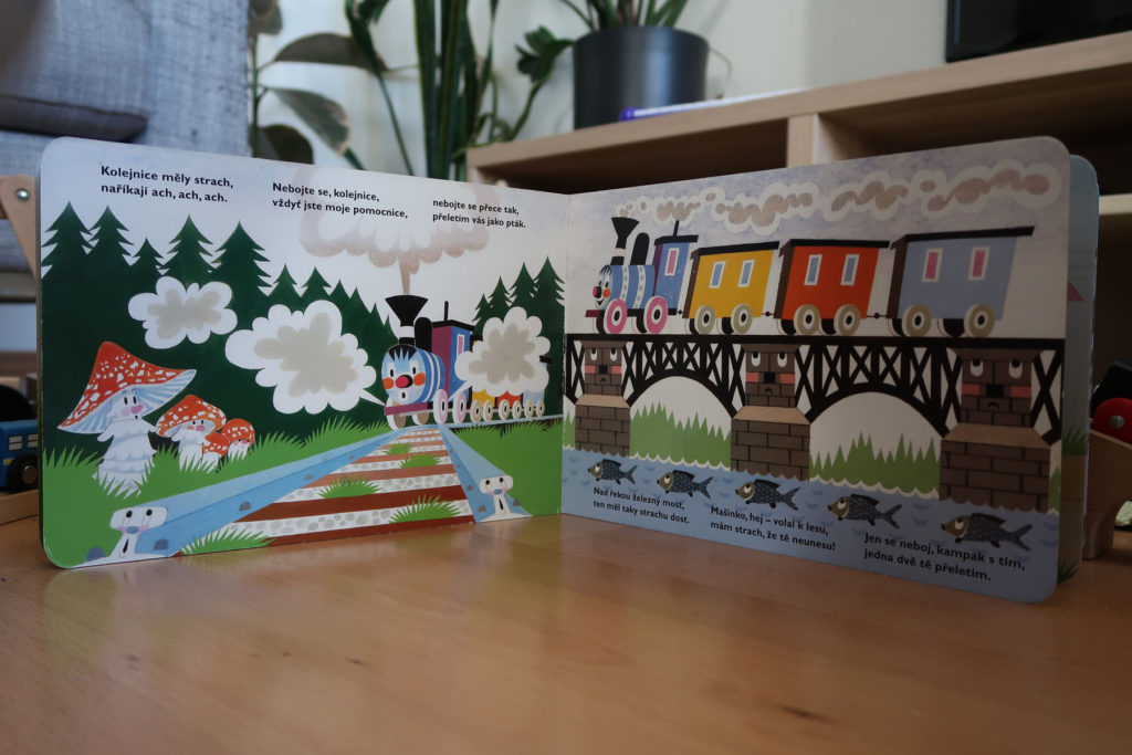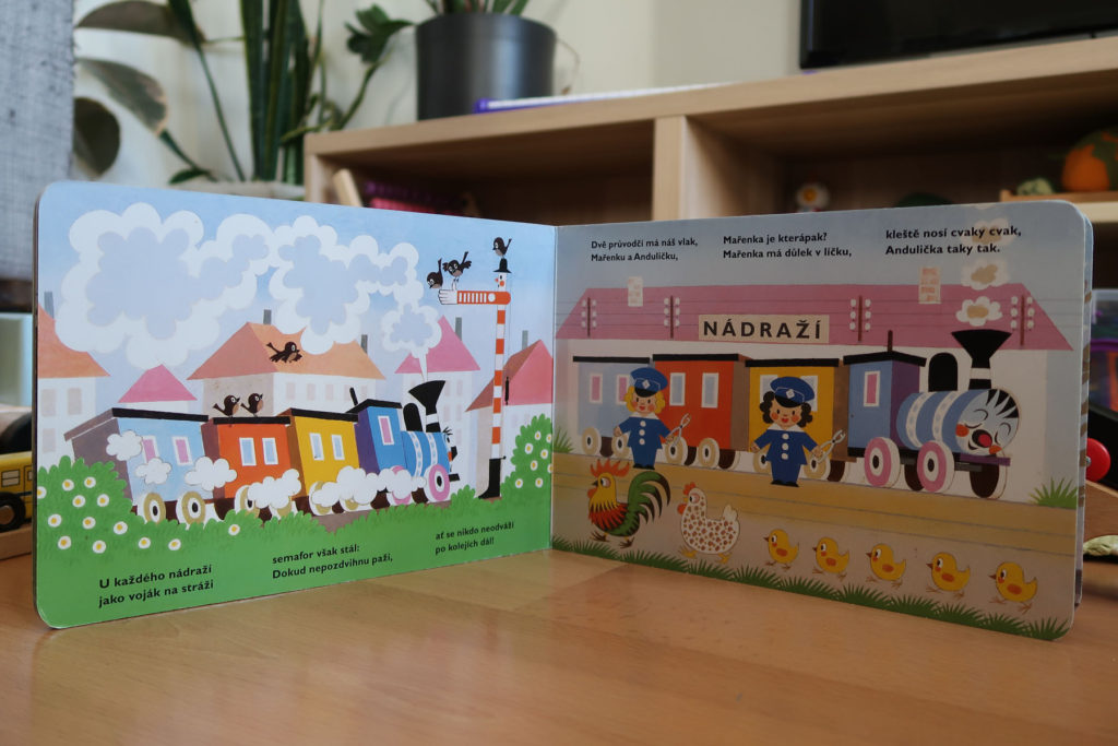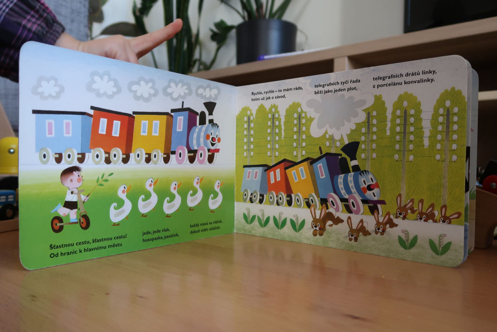 Príbeh o mašinke, ktorá si to sviští od hraníc k hlavnému mestu, mal rád už pampúch pred troma rokmi. A teraz ju miluje mrňátko. Keď hovorím miluje, myslím tým, že ju čítame niekoľkokrát denne. Text viem samozrejme naspamäť a som schopná ho recitovať o polnoci zo spánku. Už som ho deťom rozprávala cestou vlakom, v čakárni u doktorky, v nekonečných supermarketových radách… Všade, kde potrebujem zahnať nudu. Na prechode si pripomíname, že „na červenou pozor dát, ihned zastavit a stát!“. Mrňátko síce nerozpráva, ale natešene achká ako ustráchané koľajnice, cvaká prstami ako sprievodca kliešťami a pred spaním ukladáme mašinku so slovami „há-há“ (škoda, že na ďalšej strane sa píše „dlouhé spaní, zahálení, pro mašinku správnou není,“). Môžem kľudne povedať, že básnička o mašinke je už súčasťou nášho domáceho folklóru.