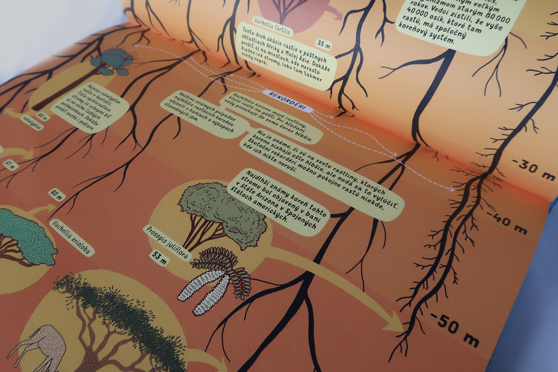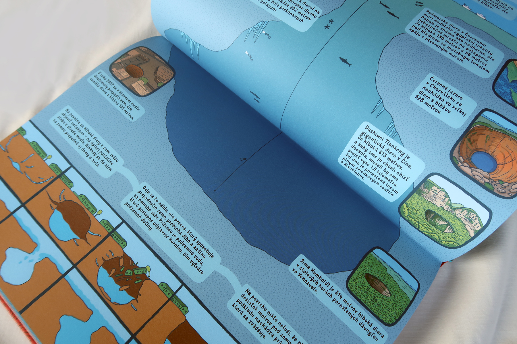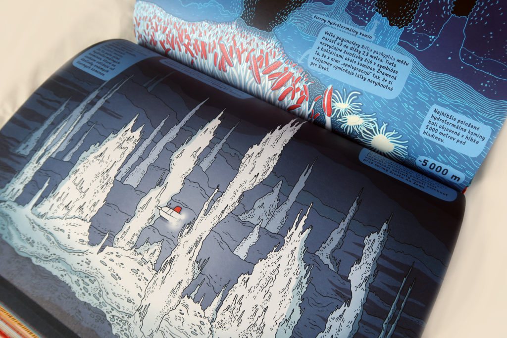 Je to totiž netradične vystavaná náučná kniha. Neberie si ako tému jednu oblasť vedy (alebo pár príbuzných), ale rovno celú plejádu rôznych odvetví. Od histórie, geológie, cez biológiu a zoológiu, fyziku a techniku… Nájdete tu popísané rôzne typy chodbičiek a nôr, ktoré si zvieratá pod zemou budujú. Dozviete sa, ako hlboko siahajú korene stromov, ako sa rozvádza do domov elektrický prúd a voda. Budete vedieť, ako vyzerá najhlbšia známa jaskyňa alebo baňa na svete. Aj to, čo všetko sa vyrába z rôznych surovín. V knihe je napísané, ako a prečo pôsobí tlak vody na potápačov, aké odevy sa používali na potápanie v minulosti. Samozrejme nechýba ani prehľad najväčších morských tvorov a obyvateľov hlbín…