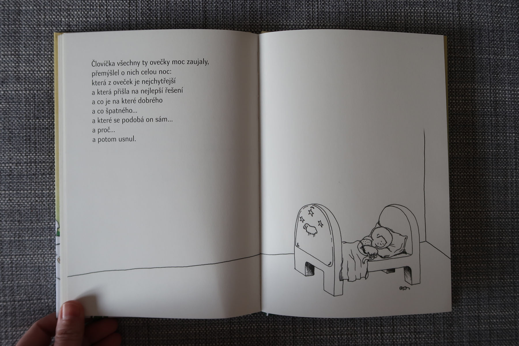 Na začiatku je malý človiečik s problémom. Problémom tak veľkým, že mu nedovolí spať. A tak začne počítať ovečky. Ovečky dostanú za úlohu prekonať prekážku. Čitateľ potom s úžasom sleduje, aké riešenia si ovečky vymysleli. Od jednoduchého preskočenia, podlezenia, cez rôznu spoluprácu. Alebo problém naopak nevyriešili vôbec, ignorovali ho, zvolili očividne zlý prístup…