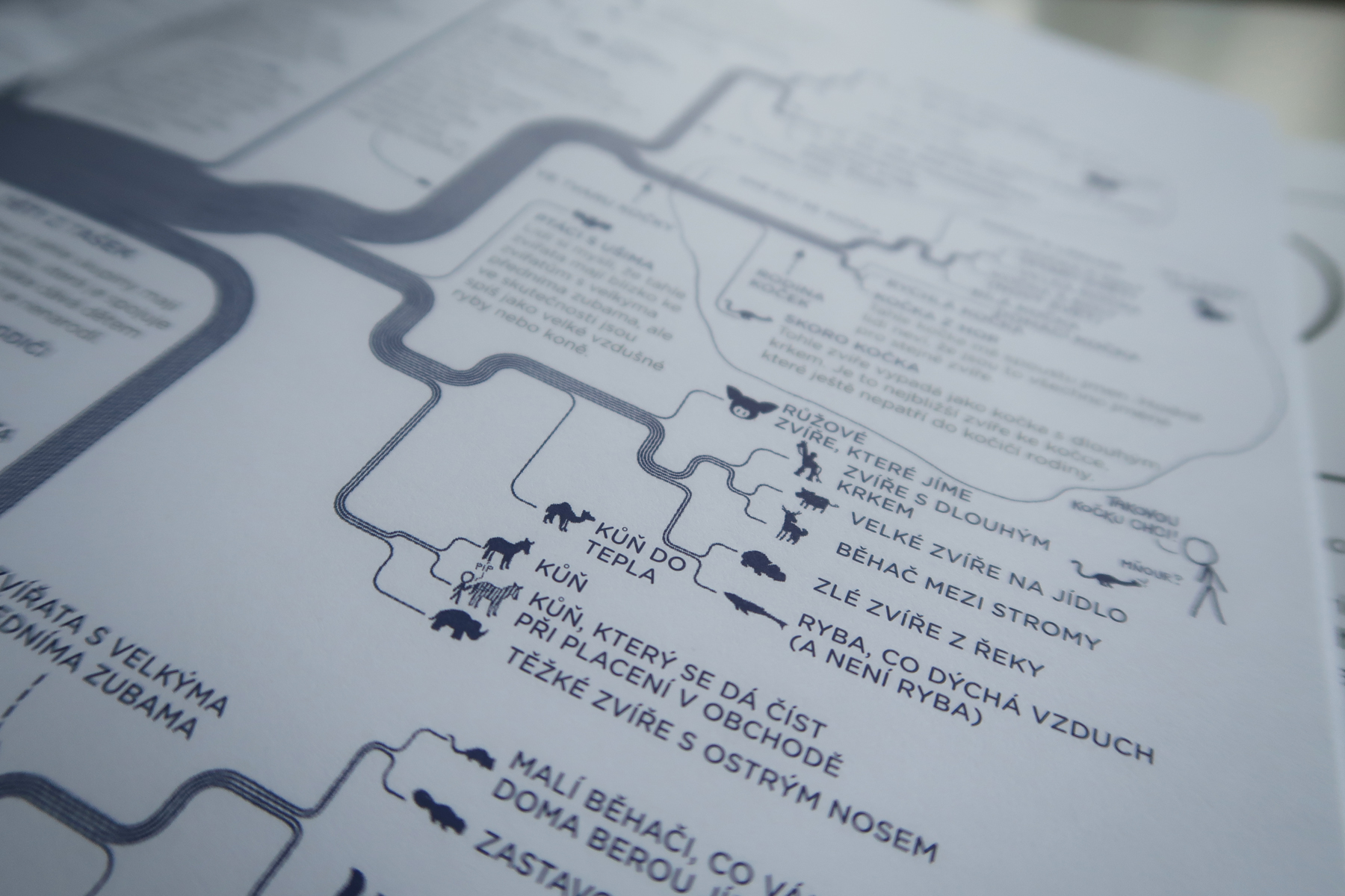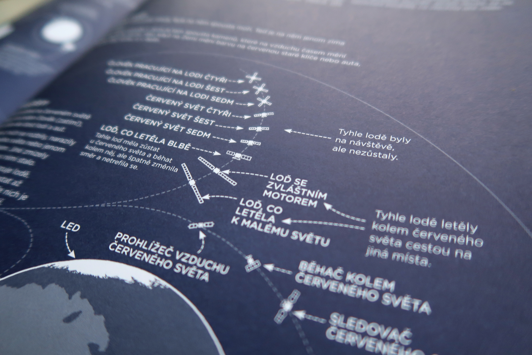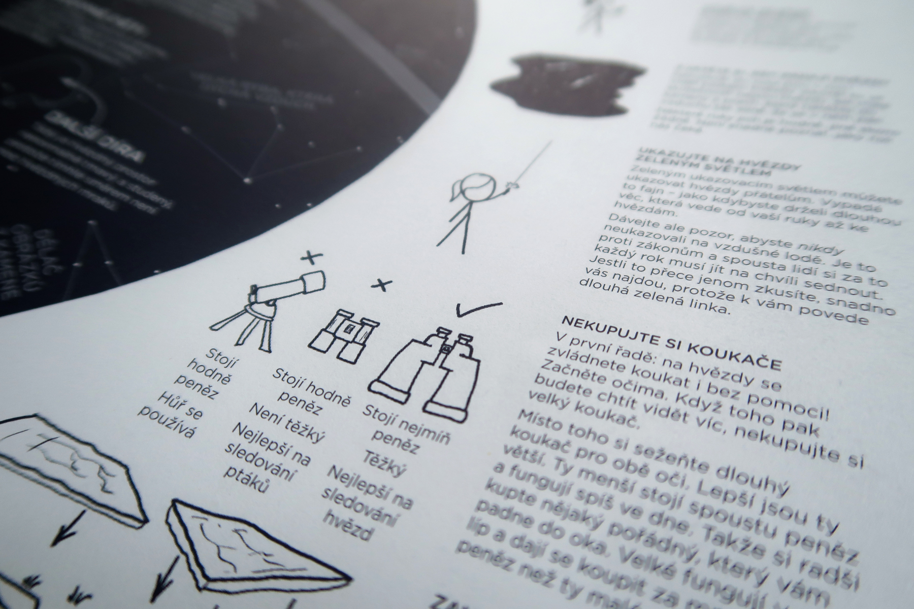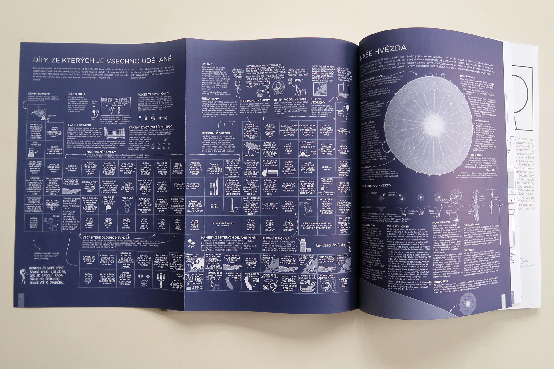 Velký vysvětlovač napísal Munroe ako pokus zjednodušiť zložité veci a popísať ich fungovanie jednoduchými slovami. Vybral si preto tisícku najpoužívanejších slov. Aby knihe nechýbal vtip, rôzne ich komolil. Tak napríklad namiesto „srdce“ použil spojenie „tlačič krve“, namiesto „dalekohled“ slovo „koukač“. Z toho vám už dúfam je jasné, že kniha nemá čitateľa naučiť, ako sa rôzne veci nazývajú. Na dvojstrane s názvom „Světy kolem Slunce“ sa nedozviete, aké planéty sú v našej slnečnej sústave. Munroe totiž s čitateľom hrá hru: hádaj, na čo myslím. A hrá ju geniálnym spôsobom. Napríklad práve pri tejto dvojstrane sú popísané „hviezdne lode“, ktoré leteli na „Malý červený svět“. Trvalo mi dobrú štvrťhodinu, kým som ich všetky identifikovala (nakoniec s pomocou wikipédie). Veľmi ma to bavilo.