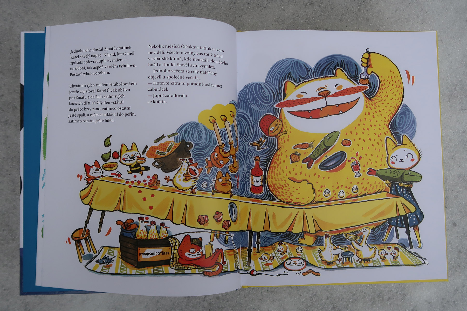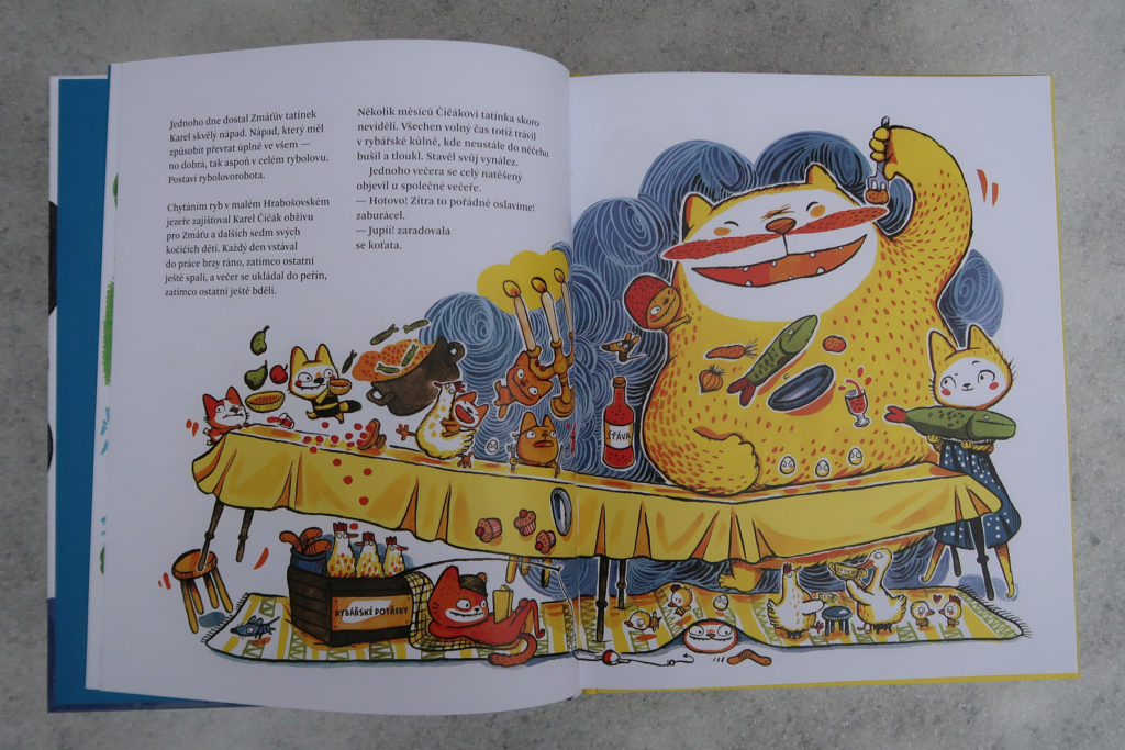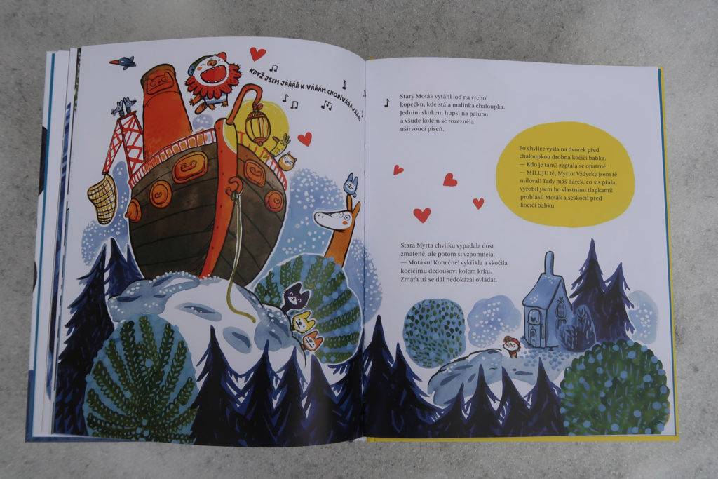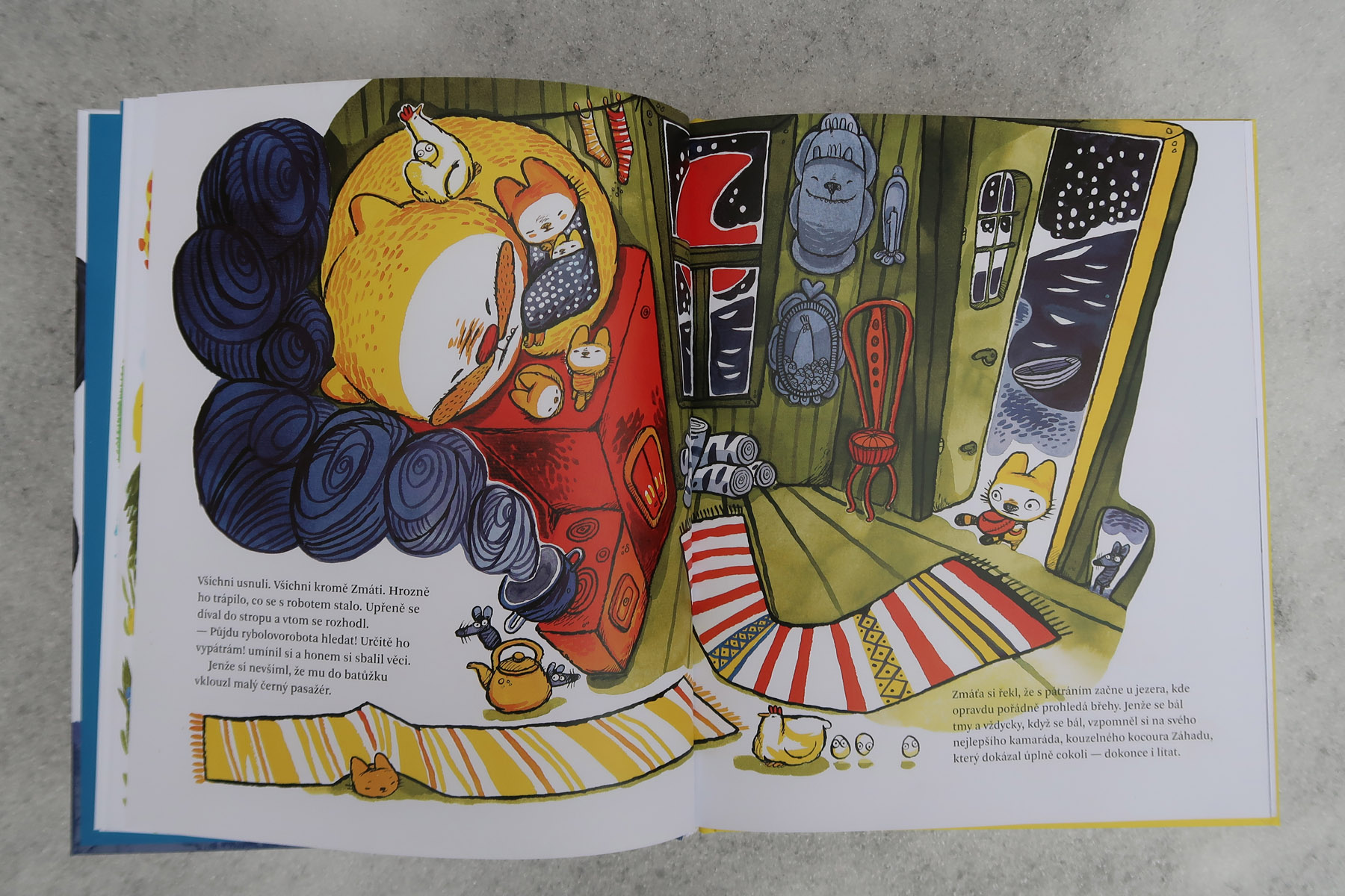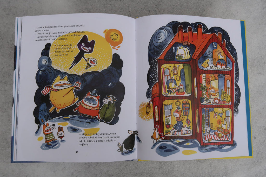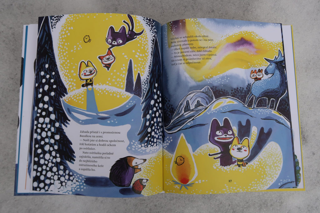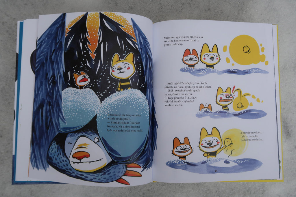 Zdá sa mi, že oproti prvej časti sa autorka viac odvážila. Príbeh je vtipný, originálny a prekvapivý (dôvod únosu robolode ma rozosmial). Ale najviac je to vidieť na ilustráciách. Všechno dobře dopadne je krásna a nevšedná (v miestnych knižných vodách), ale táto je doslova výbuch farieb. Dej nestráca na dynamike a ilustrácie to ešte podtrhujú. Kombinácia žiarivo žltej a tmavomodrej je veľmi vydarená. Okrem toho aj tu nájdete množstvo vtipných a milých detailov (okaté vajíčka, medveďa schovaného pod snehom, čítajúce koťata). Písala som už, že sú neskutočne roztomilé? Skrátka ňuňu.